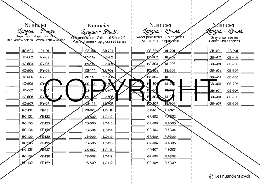 En choisissant les nuanciers pré-conçus, c’est le combo gagnant ! Vous n’avez plus qu’à imprimer et colorier les cases vierges du nuancier !